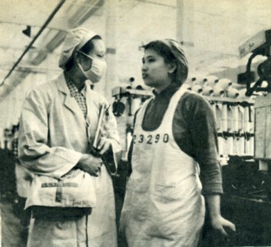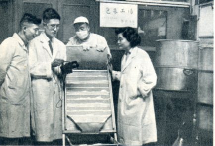 王其灼夫妇和公方代表薛金芳(最左)视察药厂的新设备。