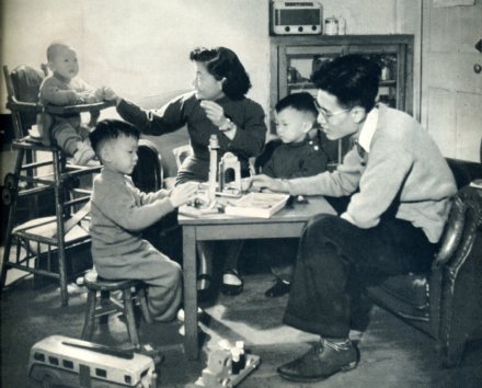 王其灼和郎继芳的家庭生活。坐在王其灼对面的就是他们大孩子“阿辉”。