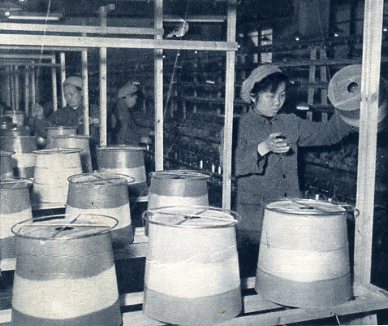 并线车间用改装的棉纺机把200根玻璃丝并成一股线。