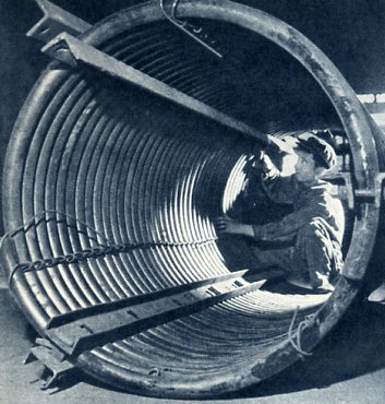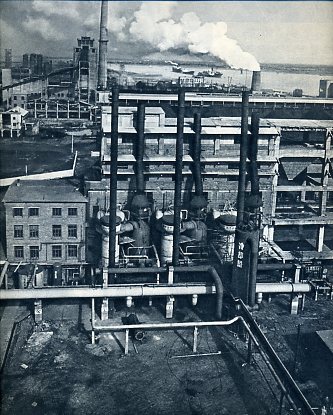 上海钢管厂经过工人们的苦心钻研,已生产了许多无缝钢管新品种。其中有管壁达十多个毫米的高压钢管。有象注射针头一般的钢管。图为:用高压钢管制造的大型化肥工业设备。