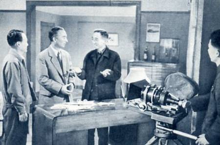 我国第一部彩色宽银幕立体电影故事片“魔术师的奇遇”,正由上海天马电影制片厂拍摄。这部影片通过一个流浪国外的魔术师陆幻奇重返祖国寻子访友的故事,生动地反映出上海社会主义建设的新面貌。这是导演桑弧(右)和饰陆幻奇的演员陈强(中)、陆幻奇儿子的演员韩非,在研究怎样表演他们父子相见不相识的一场。