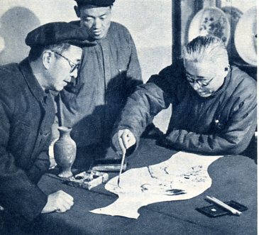 著名画家王个簃(作画者)、唐云(左一)为上海益丰搪瓷厂设计花样。