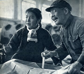 第二期工程又开始了,助理技术员江兰娥和负责机器安装的老技工张顺生在研究工作。
