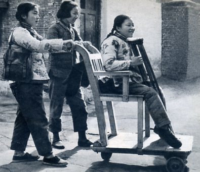 张雅芳考进东光中学后,同学们为她做了一辆木车,由六个少先队员轮流接送她上学。