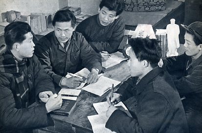 青年职工们利用业余时间努力学习毛主席著作,这是管瑞刚“五好”互助组在一起学习和讨论。