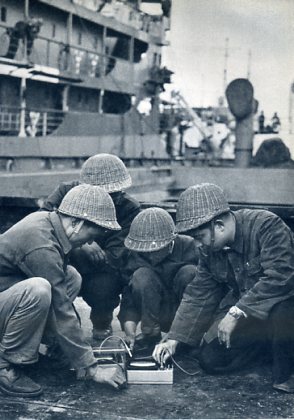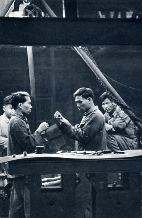 超声波脉冲式晶体管测厚仪已在上海中原电器厂成批生产并在船厂广泛使用。这是工人们用测厚仪检查钢板腐蚀情况,右为测厚仪的主要创造者杨君劲工程师。