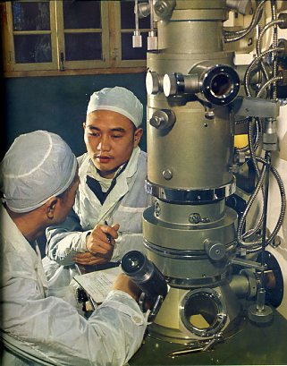 由上海许多工业、科学研究单位协作制成的二十万倍高分辨率电子显微镜。