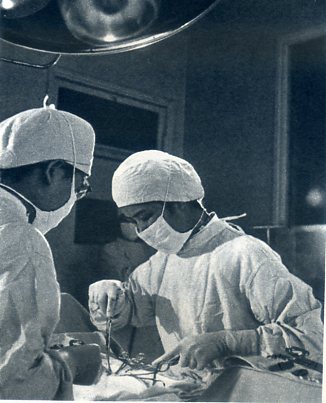 上海各医院一百名护士、助产士、医士、防疫员、药剂士、技术员和检验士,最近被提升为高级医务人员。这次提升的中级医务人员中,有的是在专业工作中经过刻苦钻研,具备了比较丰富的实际工作经验和医务理论知识,也有许多人经过业余医学院培训,达到了相应的水平。这是被提升为医师的上海国际妇婴保健医院原助产士孙菊芳(右)在给病人作妇科手术。