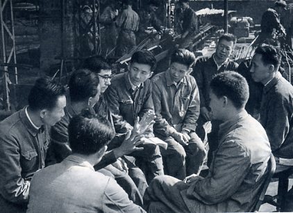 工厂领导干部经常和工人一起研究生产上的新课题。