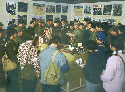 上海各级党组织经常对民兵进行阶级斗争和路线斗争教育。这是上海铁路局民兵在参观反映劳动人民解放前受压迫和剥削的泥塑《收租院》。