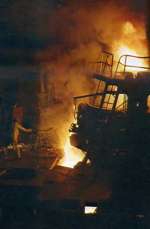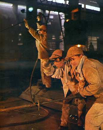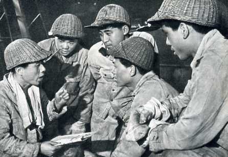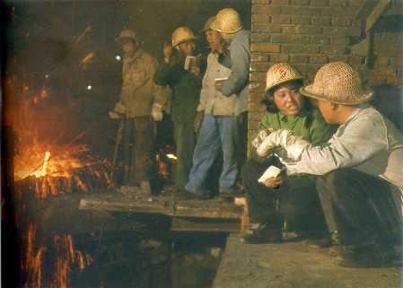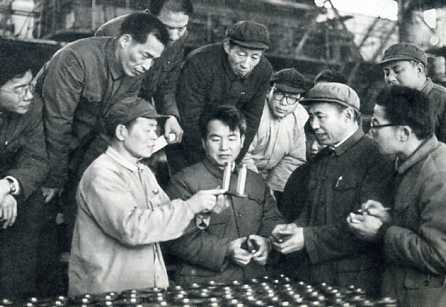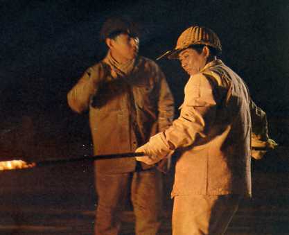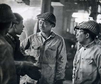 上海第五钢铁厂是我国冶金战线学大庆的先进企业之一,工厂领导干部(右)在炼钢炉前和工人一起劳动。