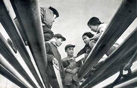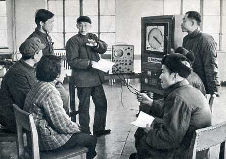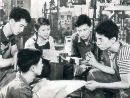 上海科技交流站队员和工人一起研究无线电遥控浇铸。