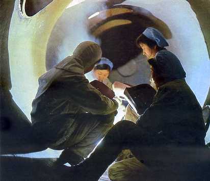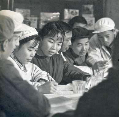 广大工人认真学习马列著作和毛主席著作,这是第二电炉车间工人在学习、讨论马克思的《资本论》。