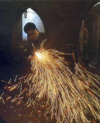 文化大革命以来,上钢五厂工人为革命多炼钢、炼好钢的干劲越来越高。这是第一电炉车间工人改革了电炉膛和炉口,使产量提高了百分之五十。