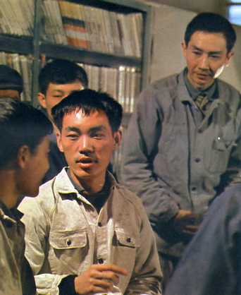 党支部书记任锡康(右),以大庆“铁人”王进喜为榜样,和工人们一起战斗在生产第一线上。