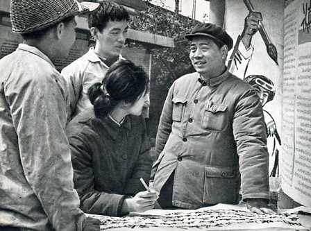 发扬对革命、对人民彻底负责的精神,车间干部(前左二)走访用户,征求对产品的意见。