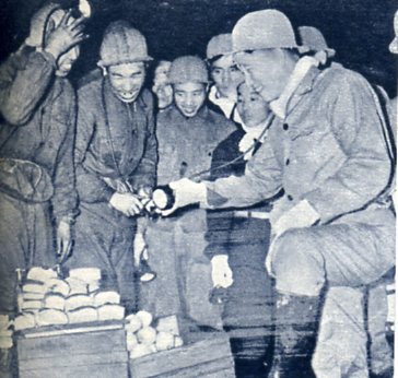 山西大同矿区的同家梁商店,想尽各种办法来为矿工服务,服务有项目有50多种,做到了要啥供应啥,啥时要啥时有。这是中央商业部部长程子华(右)来到井下供应商店询问供应情况。