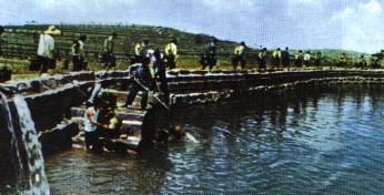 城关人民公社南关队,在乱石遍地、杂草丛生的坡顶上建起了蓄水池。(1970年)