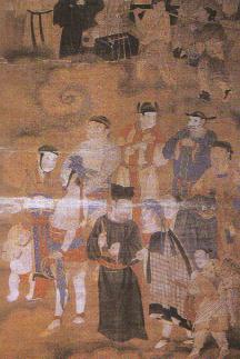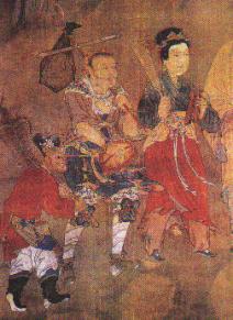 宝宁寺水陆画—元代戏班赶路图。宝宁寺原存水陆画一堂139幅,绢地,为明代所绘。此为“第五十七,往古九流百家诸士艺术众”图局部,绘出三位戏剧演员,作携带道具乐器赶路行进状。