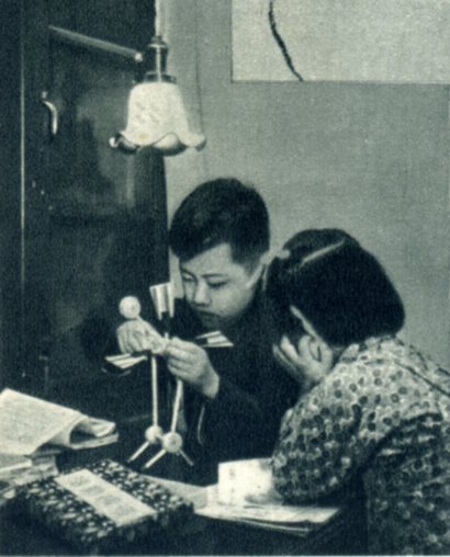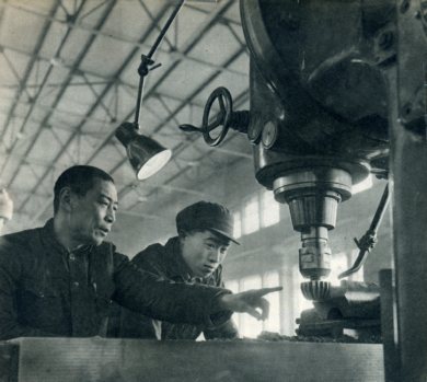 老工人田锦高(左)在指导青年工人操作。在试制新产品中他改进了80多种工具。