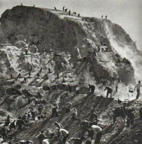 坚持二十年大搞水土保持的河曲县曲峪大队,基本上做到了泥不下山,水不出沟。图为社员们在治理山坡。(1973年)