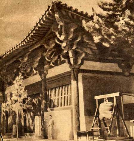 山西省五台山豆村佛光寺大殿,唐宣宗大中十一年(公元857年)建造,是我国现存最古的木建筑。在时代的特征上,这殿的“斗拱”雄大简练,是唐代建筑所特有的。(1952年)