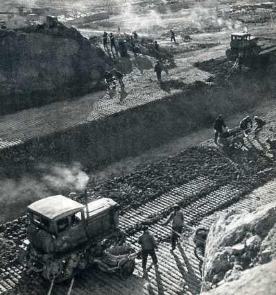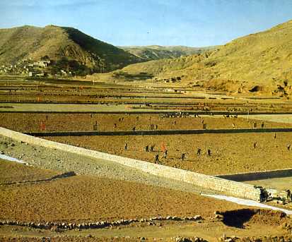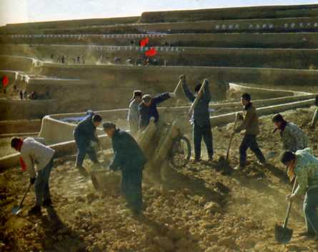 南关大队社员正在修建保水、保土、保肥的水平梯田。