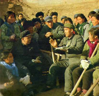 县委书记李锁寿向干部和社员传达第二次全国农业学大寨会议的精神。