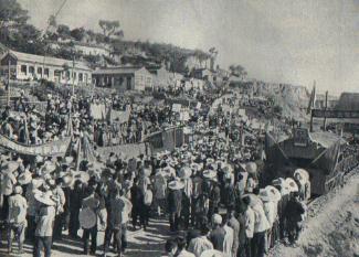 太行山里的盂县,在26天内用自己的力量修起了一条小铁路,制造了一列小火车。图为盂县办小铁路的通车典礼。(1958年)