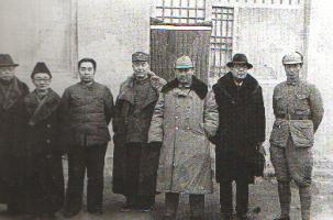 1949年2月,周恩来与前來西柏坡的傅作义(右三)、邓宝珊(右四)及前來商谈国共和平谈判和南北通航通邮等问题的“上海和平代表团”成员颜惠庆(右七)、江庸(右六)等合影。