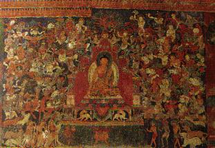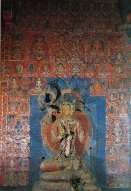 - 在日土县班公湖东北乌江河谷山沟内。山洞名“顶琼拉康”,高和宽各有4米左右,顶部和四周石墙经过粉刷,其上画满各种圆佛像和舞蹈人物。壁画以“坛城”画最多,分佛教和本教两种,形状不同,均外圆内方。洞门两侧是菩萨佛像,左侧墙上画有地狱饿鬼图、变形裸体男女人像。从壁画内容和风韵推断,带有明显早期藏族社会的民间绘画风格。此外,在“顶琼拉康”附近,还发现有大型岩画群,岩画人物和动物形体特殊,是研究西藏早期社会绘画艺术的珍贵资料。