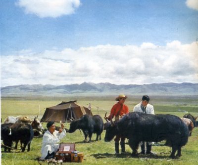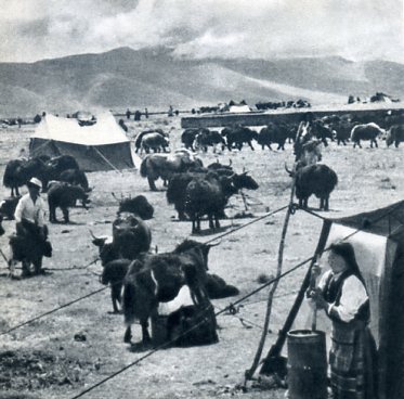 当了四十多年奴隶的索朗,过去家中没有一头牛羊。民主改革后,分得了三十二头牦牛和一匹马。这是索朗家在挤牛奶。