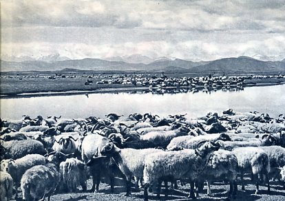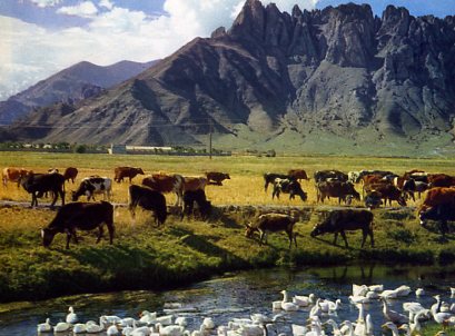 从江苏无锡引进来的大白鹅。正在放牧的牛群中,有些是荷兰牛和本地牛杂交生的第一代。