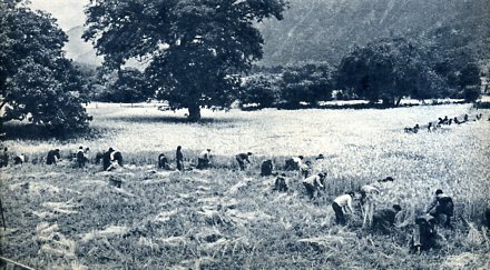 林芝专区波密县的军、政干部帮助互助组组员们收割庄稼。
