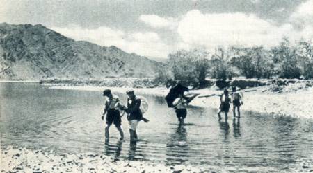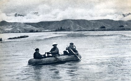 根据国务院关于帮助西藏地方进行建设事项的决定而组成的西藏工程勘察队已在拉萨平原上展开勘测工作。图为队员们扛着仪器涉水前进。