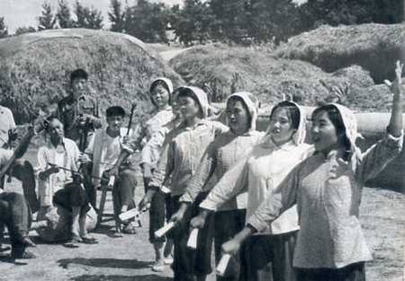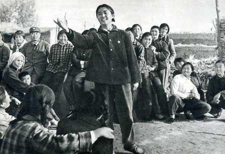 在小靳庄姑娘们坚决不收彩礼的新风影响下,王卜庄公社女青年郝振敏(左二)来小靳庄退彩礼,受到了社员群众的赞扬。