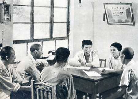 知识青年和社员在政治夜校学习无产阶级专政的理论。