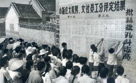 深入批判林彪、孔丘“男尊女卑”的反动思想,实行男妇同工同酬。这是大队在公布劳动工分评定结果。