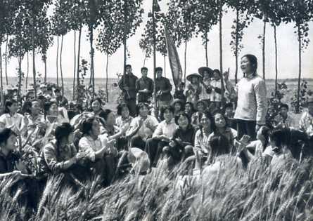 “燕子队”已成为司家庄大队生产上的一支突击力量。这是她们在劳动休息时学习革命宝书《毛主席语录》。