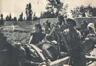 库尔勒县的夏日,炎阳普照,铁克其公社中卡其大队的社员们正忙于夏收。大队根据当时实际情况,一方面紧凑地安排了社员们的劳动,同时还适当地安排劳逸结合,实行了假日制度,使社员们在十分紧张的夏收劳动中始终保持着充沛的干劲,劳动热情很高;因而大队提前七天完成了夏收任务。图为社员们顺便搭上大车进城去,买些家庭日常用品。(1961年)