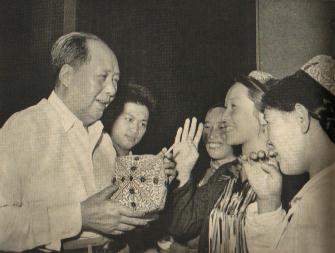 参加共青团第九次全国代表大会的墨玉县火箭公社劳动模范努尔汗(右一),把自己精心绣制的一顶维吾尔族小帽献给毛主席。孟庆彪 摄影