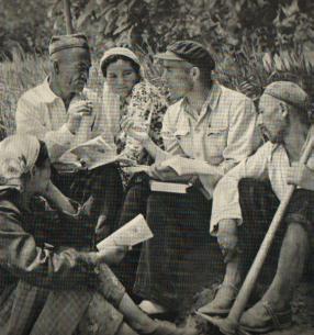“读毛主席的书,听毛主席的话,按照毛主席的指示办事。”墨玉县五一公社的干部和社员,在地头学习毛主席著作。