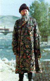 穿长袍的哈萨克族男子。哈萨克族人大都从事畜牧业,过着逐水草而居的游牧生活。牧民的衣服大多用皮毛制成,为便于乘骑,一般都很宽大,衣袖较长。不同地区和部落的衣饰有一定差异。男子冬天穿结实的冬羊皮大氅。