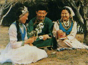 锡伯族服饰。传统的锡伯族男装为大襟长袍和对襟短袄,腰系宽带,外罩坎肩,头戴圆顶小帽,脚穿长筒皮靴,服装兼有满蒙服饰的特点。女子穿长袍,齐腰小坎肩,衣襟、袖口、领口、下摆多有边饰。锡伯族女子头饰与蒙古族相似。年轻女子的头箍上缀有银币、贝壳、宝石和金花银饰。