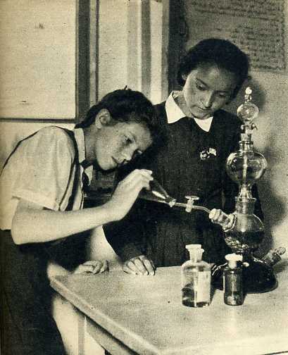 塔塔尔族女生塞土娜(左)和维吾尔族女生哈马尔妮莎(右)正在作化验气体的试验。