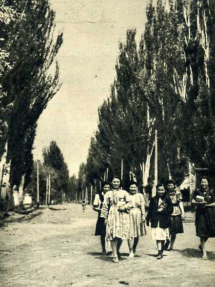 新疆省伊宁市宽阔的林荫大道上,成群的各族少女拿着书本向学校走去。