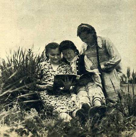 塔塔尔族的托廖等三位女生在看画报。