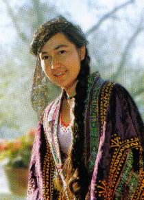 穿袍服的乌孜别克族女子。乌孜别克族妇女善于刺绣和镂空。传统袍服刺绣精美,东方色彩浓厚。