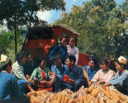 傣族干部、坝弯公社革委会副主任孟有金(中)同各族社员在一起交流学习马列和毛主席著作的心得体会。