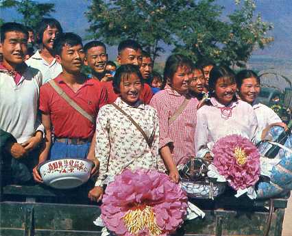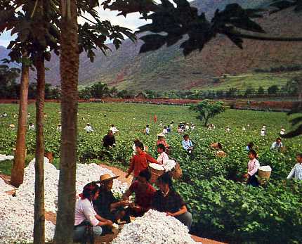 在采棉季节里。前边左起第二人是道街公社大队科学实验小组组长杨钊。
